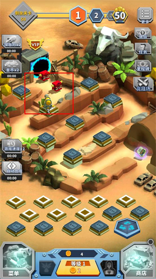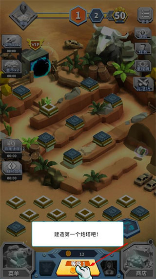 1、进入游戏界面后,找到底部标有“等级1”的按钮,点击该按钮建造第一个炮塔。