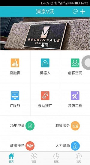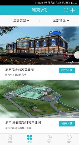 在底部导航条有四个大模块,分别为首页、项目、社区以及个人信息等。项目模块中,包含了我司旗下所有园区项目,可供游客参考并且可以申请入驻。社区功能板块则包含了社区动态以及新闻话题两个子模块,功能都是提供资讯供客户阅读。