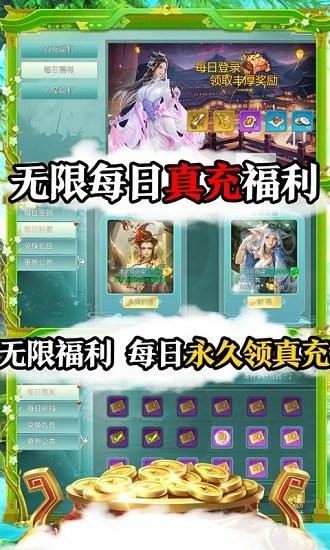 2、无限真充福利:无限福利永久每日无限领真充!诚意满满不玩套路!主线任务再送无限充值卡!