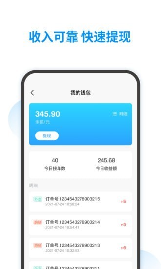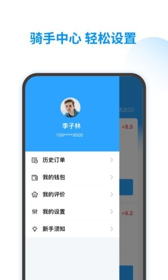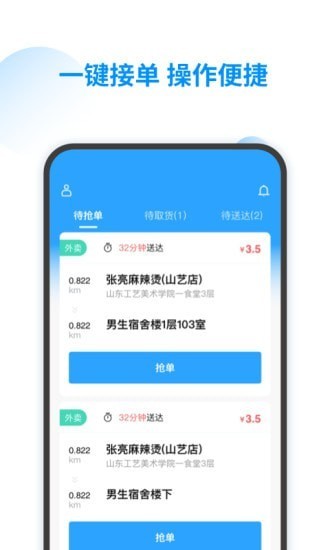3、帮助用户进行骑手接单服务,为用户提供完善的配送服务,团结互助、实名必达