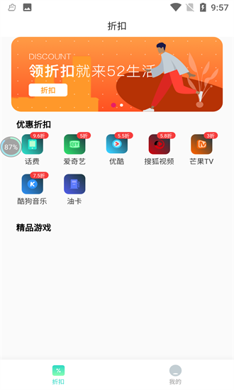 52生活是生活类优惠折扣类app,他的系统集成了多项目功能,包括很多优惠价折扣,话费、爱奇艺影视,优酷等全新的线上优惠,可以通过低价来购物视频会员,不仅价格低、而且还比较方便,更多优惠例如加油,是我们参与智慧生活的绝佳帮手,快来下载吧!