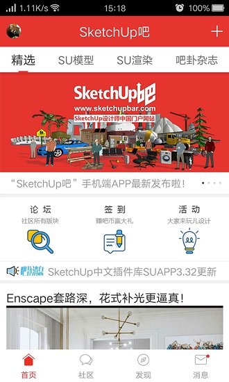 “SketchUp吧”汇聚了丰富多彩的SketchUp及相关软件的原创作品、精品模型、建模和渲染教程。您可以在这里浏览到社区中的精华资讯内容,并随时与100万名来自建筑、室内、景观和规划等行业的设计师共同交流切磋,一起玩转SketchUp吧!