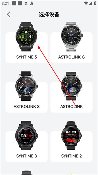 2、在选择设备页面中,挑选对应的北斗卫星手表型号,进入搜索设备页面。