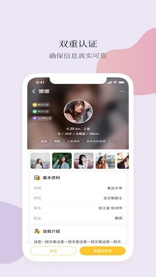 [双重认证]为给大家创建一个安全靠谱的交友环境,Feelike要求每位用户完成身份和学历双重认证,以确保用户信息的真实性。