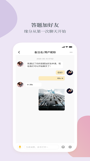 1、答题才能添加好友,添加后能语音、图片等方式聊天。