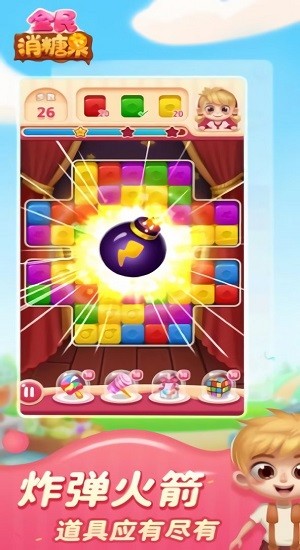全民糖果消是一款非常有趣的消除手游,游戏画风卡通可爱,颜色非常丰富,你需要在关卡中吧相同的方块碰到一起就鞥互相消除,非常欢乐,你也可以使用道具炸弹来消灭不好消除的地方,快来这里释放你的压力吧。喜欢这款游戏的玩家欢迎来下载。