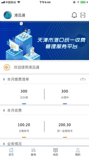 港迅通移动平台端帮助贸易运输等企业及时接收平台同时提醒等信息,查看收缴费清单及账单详情,以及标准费项和企业费项的查询。