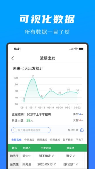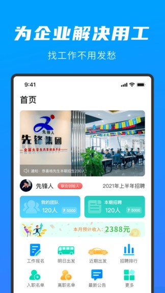 招聘管理app是先锋人劳务管理系统的手机客户管理端,基于贵州先锋人网络科技有限公司,通过手机平台为广大创业、务工人员提供丰富的最新企业招聘信息,帮助求职者办理入、离职企业,在线调单可与同行业公司互用求职资源,实现驻厂高效、便捷、移动在线管理方式。
