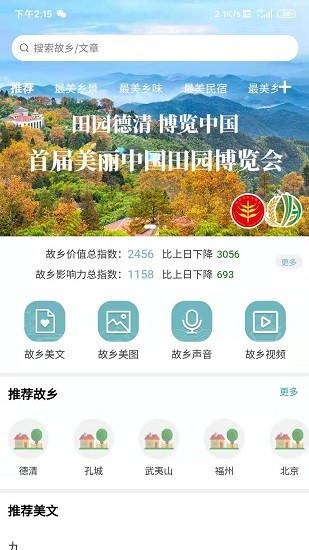 1、查看关于故乡的一切动态信息,参与各种志愿活动,投稿精选文章内容。