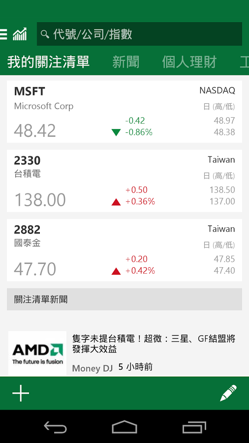 自动在网页版「MSN 财经」与您的行动装置应用程式之间同步您的关注清单,让您快速存取您关注的股票。