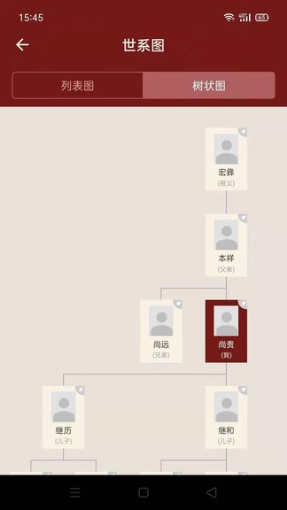 2、快速浏览五服关系。切换中心后可以方便的浏览本人的五服关系脉络;