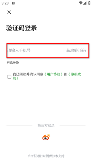 3、选择验证码的方式登录,输入手机号并点击获取验证码。