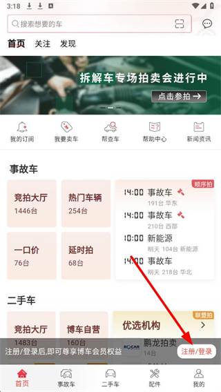 1、打开博车网拍卖应用,点击底部导航栏中的二手车选项。