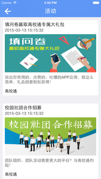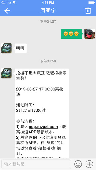 高校通app是专为高校师生精心打造的一个校园服务平台。本软件为在校师生提供了丰富的校园资讯,用户可以及时了解到学校的最新动态。通过该平台,学生用户可以随时随地查看校方发布的各类信息,可以在线查询自己的考试成绩。教师用户可以使用软件管理班级学校,在线和学习们进行学习和生活上的沟通,促进师生间的感情。是最受高校师生用户喜爱的一个校园教育平台,欢迎下载体验。