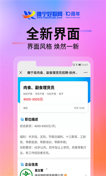 睢宁好职网app是睢宁地区优秀的求职招聘平台,致力于为睢宁中小企业在人力资源开发环节提供积极的解决方案,为求职提供及时、可靠的招聘信息,在当地享有较高的知名度和美誉度!睢宁好职网自成立以来在睢宁本地先后服务于千百度、时代天勤、全友家居、惠利隆、卓达地产、圆通快递、荣盛酒店、中国平安、蓝天广告、京东集团、森博国际、怡信物业、童心童画、天虹纺织、九旭药业、尚品宅配、德尊名车等企业,受到了企业的一致好评!