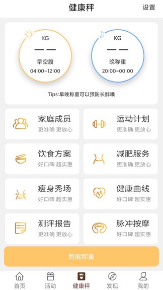 1、具备健康秤、移动商城、健康档案、活动参与、饮食方案、运动计划等功能;