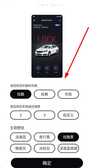 3、在风格设置页面,选择偏好的风格、遥控键数、主题壁纸,完成后点击确定即可应用新风格。