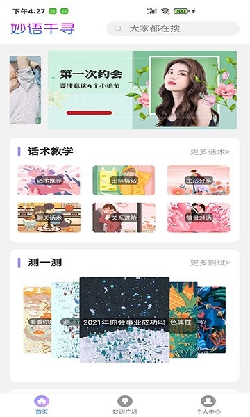 妙语千寻app给你丰富的恋爱术语教你恋爱可以畅意的聊天,丰富的恋爱干货趣味的恋爱社区帮助你解决恋爱的烦恼,海量的视频分享等非常的趣味,让你的表白恋爱可以更加的便捷,有需要的用户就来下载吧!