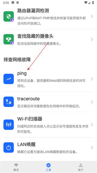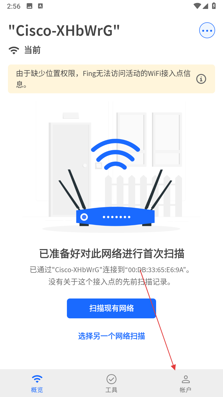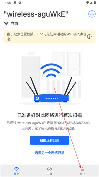 1、打开fing网络扫描仪APP,点击底部导航栏最右侧的帐户选项,进入帐户页面。