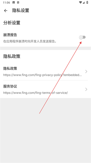 4、在隐私设置页面的分析设置区域,点击崩溃报告对应的开关按钮。
