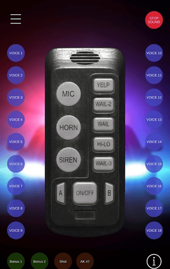 警笛模拟器专业版能够模拟差多警笛的声音,每歌遥控器都对应着不同的声音,想发出哪种声音就可以摁哪个按钮,这款软件可以用来整蛊你的朋友,让她感到害怕,而且手机界面还会有警车闪烁的灯光哦,快来试试吧!