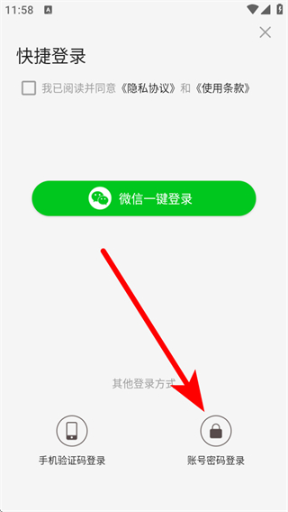 3、在快捷登录的界面,点击账号密码登录,进入账号密码登录页面。