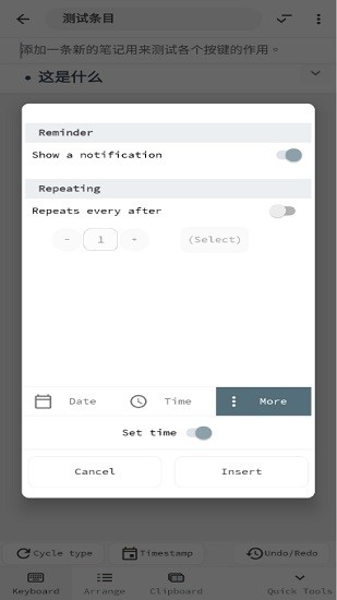 在笔记编辑界面,通过点击功能区,用户可以快速插入日期、时间从而对记录的条目进行有效的时间划分,在添加时间的同时,ideate 还支持提醒并允许用户自定义设置循环提醒,这一功能对于需要定期回顾笔记的用户而言极为贴心。此外,ideate 的整理功能也以快速功能键的形式呈现,通过这些功能键,用户可以快速改变当前文字的缩进级别或是上下文位置,从而达到快速整理的笔记的目的。
