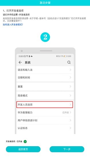 请在开发者选项中下划开启【USB调试】、【仅充电模式下允许USB调试】,未提示开启的选项请关闭,这是完成激活的必要步骤】