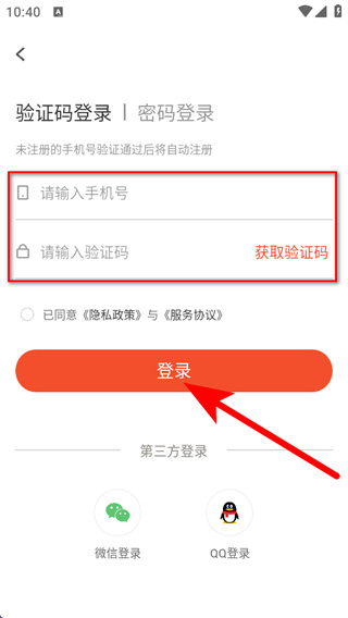 3、选择验证码登录,输入手机号、验证码,点击登录完成操作。