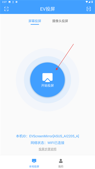 1、打开EV投屏App,在首页点击开始投屏按钮,进入WiFi连接的投屏设置页面。
