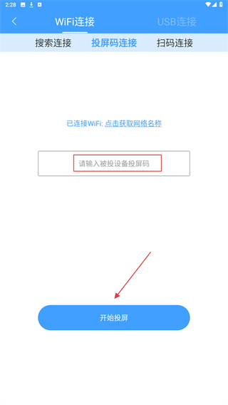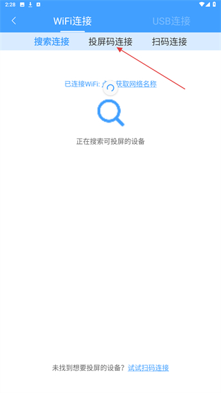 2、在WiFi连接页面,点击顶部的投屏码连接标签,切换到投屏码输入界面。