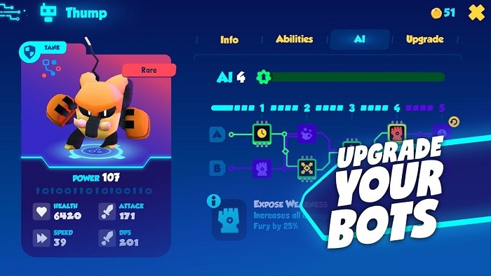 4、战斗在独特的战略战斗系统中战胜敌人。您的机器人将规划先进的能力以脚,同时借助先进的AI在舞台上跳跃,冲昏或爆炸。