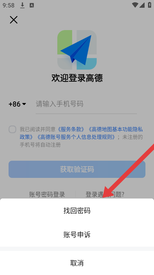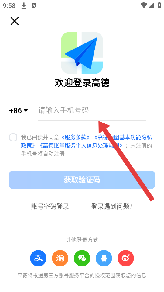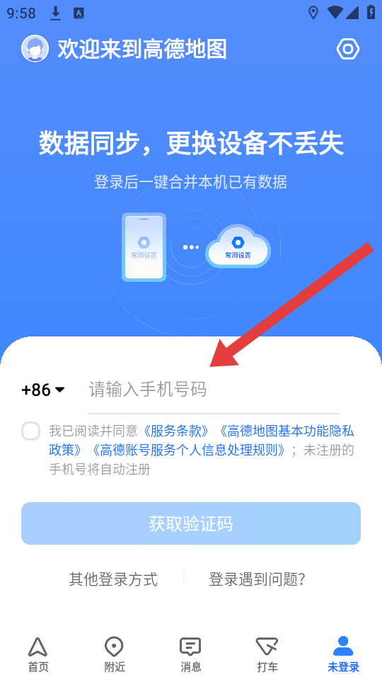1、进入高德地图登录界面,在标有请输入手机号码的输入框填写手机号,勾选协议后可点击获取验证码,开启账号登录流程。