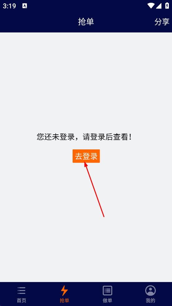 1、打开亿柜达软件,进入“抢单”页面,若显示未登录提示,点击“去登录”按钮,进入登录选择页面,可看到“一键登录”“其他登录方式”“注册”等选项。