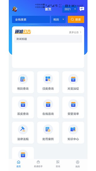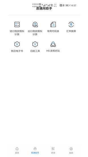 易通网,您的外贸小助手。app内存占用小,运行流畅,能够随时随地为用户提供各种外贸信息查询服务,界面简洁清晰,功能分类齐全清楚,还有相关介绍,新用户也能非常快地上手使用。同时易通网还有最新外贸政策法规资讯的推送,帮助用户及时了解信息,提早做出应对准备。