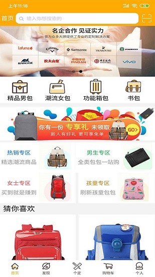 3、常用的分类专区,首页的专区中提供了精品男包、书包以及功能箱包常见类别。