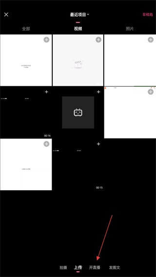 2、在创作页面底部的功能栏中,点击开直播按钮,进入直播设置界面。