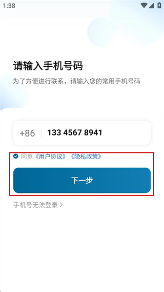 1、进入软件的请输入手机号码页面,在输入框内填写常用手机号码,勾选同意用户协议和隐私政策,准备点击下一步按钮。