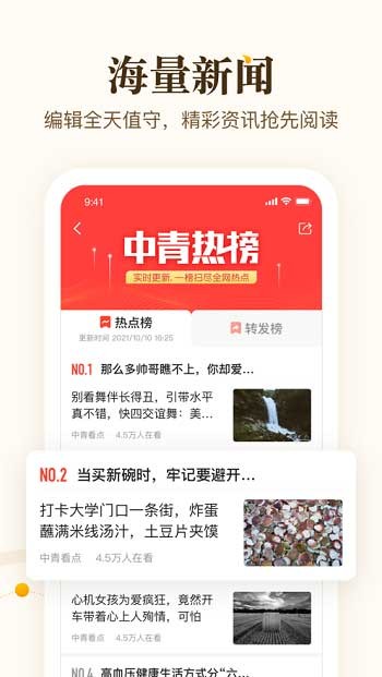 中青看点极速版是中国青年网整合众多专业媒体机构聚合而成的热门头条资讯阅读平台,是新闻资讯加头条新闻的强强结合,它基于数据挖掘,为用户推荐今日头条新闻、 国内国际快讯、娱乐新闻、新闻资讯、财经新闻及各个 类型的热点新闻资讯。