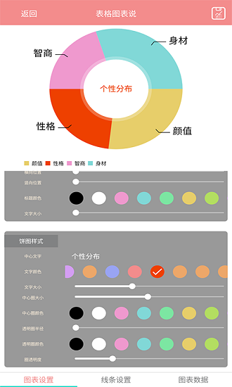 表格图表说app可以用它来将各种数据进行图表化的处理,有很多种颜色可以选择,字体大小、还有图表的透明度等等都可以在这里进行设置,是一款非常好用的图表制作软件,帮有需要的用户打造精美的图表,欢迎下载体验。