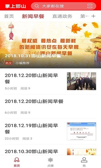 掌上邯山打开软件的首页就能查看本地的最新的新闻资讯了,这里有各种各样的新闻等待你阅读,本地人可以不注册也能观看到新闻,同时还能进行新闻筛选。线上还能观看电视,可以任意点播观看,而且画质也是非常清晰的,同时还有短视频哦。欢迎有需要的朋友下载使用!