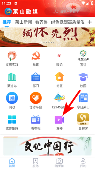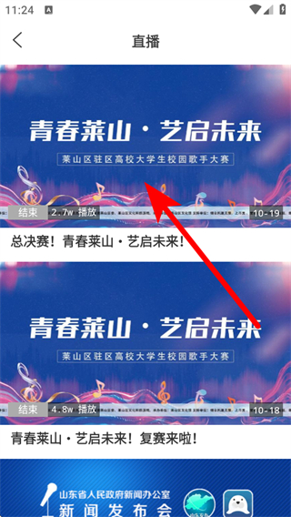 1、打开莱山融媒APP首页,点击直播选项,进入直播板块页面。