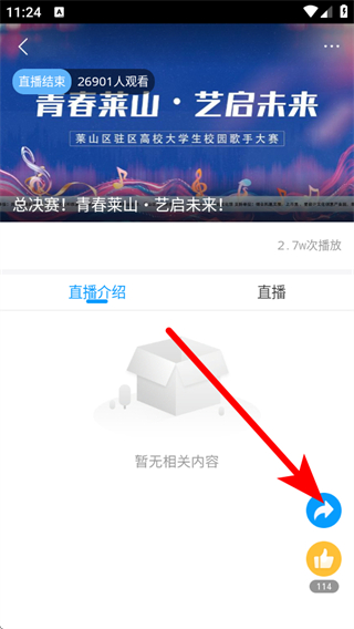 3、在直播详情界面,点击右下角的分享图标,弹出分享选项菜单。