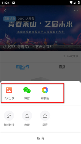 4、在分享选项菜单中,可选择任意一种分享方式,完成直播内容的分享操作。