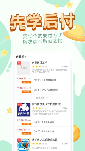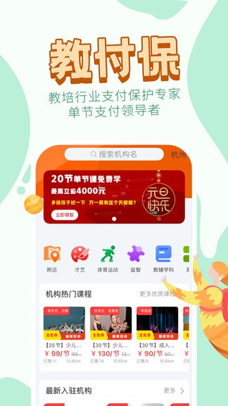 教付保安卓最新版主要提供了各种培训服务,不仅包含了学科知识的辅导教学,也有艺术、体育等培训,汇集了众多的培训机构,采用了一节课一交钱的模式,支持在手机上约课,喜爱的朋友赶快下载体验吧!