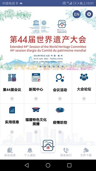 第44届世界遗产大会APP,主要用于本次大会新闻公布、大会介绍、福州介绍等相关资讯。同时向大会注册人员提供相关个人通知、文件下载、疫情防控提报等功能,还支持在线查看福建本地的特色文化和旅游景点相关内容。