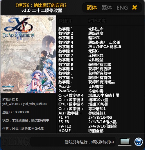 伊苏6重制版二十二项修改器是玩家风灵月影制作的该游戏的辅助工具,可以修改生命,速度,超级跳等22项属性,功能非常强大,喜欢的欢迎下载使用。