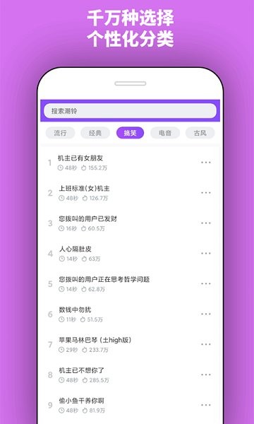 1、精细铃声分类,经典、原创、翻唱、恶搞、影视、动漫选你喜欢。