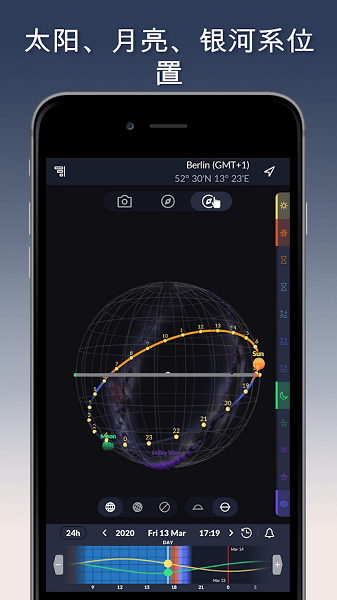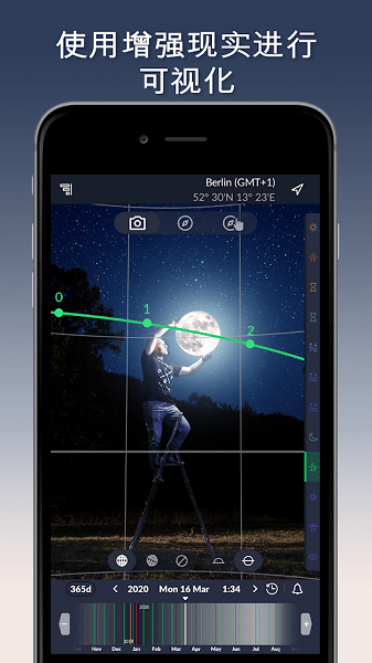 使用增强现实视图预测和可视化物体在天空中的移动轨迹。查看太阳、月亮和银河系位置的实时投影,以预测它们在天空中何时能到达您拍摄精美照片所需的位置。