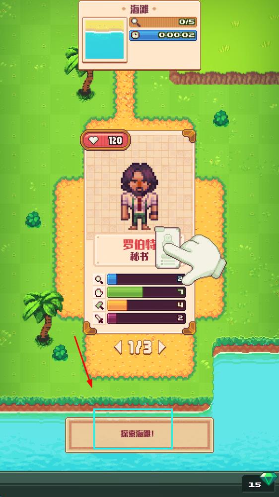1、进入游戏后,在海滩场景界面,点击“探索海滩!”按钮,人物罗伯特将前往海滩区域,按指引完成探索相关操作,过程中留意生存日志提示 。